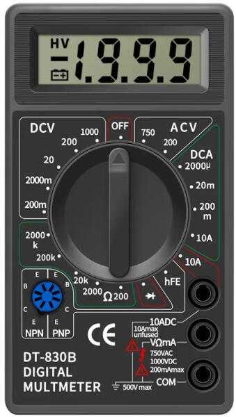 Digitális multiméter – DT-830B Ez a DT-830B típusú digitális multiméter egy praktikus, egyszerűen használható és megfizethető eszköz , amely nélkülözhetetlen minden villamossági munkát végző szakember, hobbi barkácsoló vagy háztartási karbantartó számára. A készülék ideális DC és AC feszültség , egyenáram , ellenállás , dióda , tranzisztor (hFE), kapacitás , valamint folytonosság vizsgálatára. Ezen felül beépített hangjelzés és elemteszt funkció is található benne, továbbá támogatja a hőmérséklet mérését K-típusú hőelemmel A nagy méretű, jól olvasható digitális kijelző 1999-es maximális értéket képes megjeleníteni, és alacsony elemfeszültség kijelzés is segíti a használatot. Kis mérete miatt könnyen szállítható, mindig kéznél lehet. Főbb jellemzők: