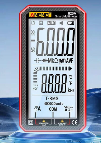 ANENG 620A Okos Digitális Multiméter – 6000 értékes kijelzés, automata tartományválasztás, TRMS Az ANENG 620A egy professzionális, mégis kompakt méretű okos multiméter , amely ideális választás hobbi elektronikai munkákhoz, villanyszereléshez vagy autós diagnosztikához is. 6000 count-os TRMS kijelzője pontos méréseket biztosít, míg az automatikus tartományválasztás megkönnyíti a használatot kezdők és haladók számára egyaránt. Főbb jellemzők: - Automatikus tartományváltás – gyors és kényelmes mérésekhez