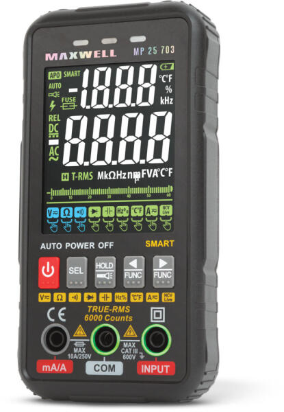 Nagyméretű, színes kijelzővel szerelt műszer, amelyről még napsütésben is könnyen leolvashatóak a mért értékek. A teljesen automata multiméter előnye, hogy a mérés során a készülék automatikusan felismeri melyik funkcióra van szükség és abban végzi el a mérést. Lehetősége van a kívánt funkciót kézzel is kiválasztani, ilyen esetben a csatlakozó körül világító LED fény segíti a mérőzsinórok helyes csatlakozását. A készülék hátoldalán található szenzor segítségével detektálhat feszültséget, anélkül, hogy megbontaná a kábelezést. A beépített munkalámpának köszönhetően szükség esetén megvilágíthatja a munkaterületet. Ergonomikus készülékház, kompakt méret és könnyű kezelhetőség jellemzi. A praktikus, keményfalú hordozótáska megvédi a terméket a szállítások alkalmával.