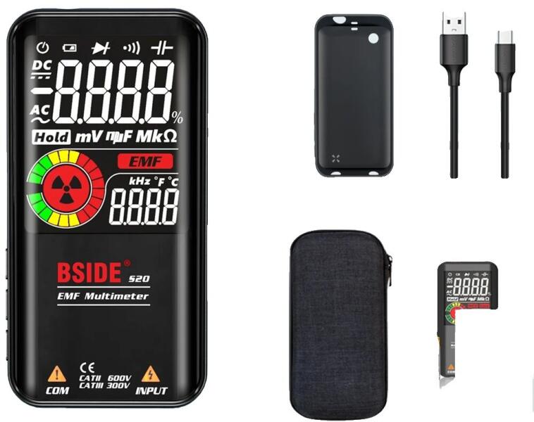 BSIDE S20 EMF Multiméter: Precíz mérések és elektromágneses mező érzékelés egyben! ⚡️ A BSIDE S20 EMF multiméter egy sokoldalú eszköz, amely nem csak a pontos elektromos méréseket teszi lehetővé, hanem az elektromágneses mezők (EMF) érzékelésére is alkalmas. Ideális választás szakembereknek és hobbi felhasználóknak egyaránt. Főbb jellemzők:Sokoldalú mérési képességek: DC és AC feszültség mérése akár 620 V-ig. ? Széles ellenállás és kapacitás tartomány: 1 - 60 M ellenállás és 1 nF - 99.99 mF kapacitás mérése. ? EMF érzékelés: Beépített EMF érzékelő az elektromágneses mezők kimutatására. ☢️ Nagyfelbontású kijelző: 9999-es számlálási kijelző a tiszta és könnyű olvashatóságért. ? Kompakt és felhasználóbarát kialakítás: Könnyű navigáció és kezelhetőség a 3,5 hüvelykes képernyővel. ? Újratölthető akkumulátor: Beépített lítium akkumulátor a fenntartható energiafelhasználásért. ? Műszaki adatok:Tulajdonság ÉrtékModell neve S20Típus Intelligens multiméterFeszültség (DC) 0-620VFeszültség (AC) 0-620VEllenállási tartomány 1-60MKapacitási tartomány 1NF-99.99MFKijelző 9999 számKépernyő mérete 3,5 hüvelykTápellátás Beépített lítium akkumulátorA BSIDE S20 EMF multiméterrel a pontos mérések és az elektromágneses mezők érzékelése egyszerű és hatékony. ?️