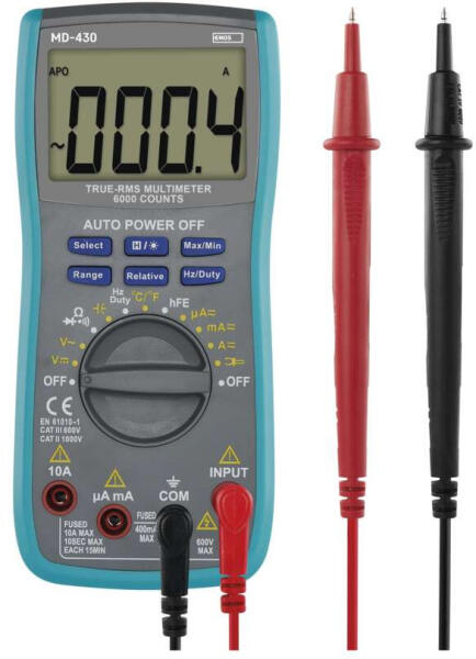 Az MD-430 felhasználóinak a gyenge fényviszonyok mellett végzett munka sem jelent akadályt a háttérvilágításos kijelzőnek köszönhetően. A nagyméretű AC/DC áram és feszültség mérési tartomány teszi ezt a multimétert igazán sokoldalú eszközzé. A True RMS funkciónak köszönhetően a műszer képes pontosan mérni bármely nem szinuszos váltakozóáramú áram- és feszültségjel effektív értékét. Ezenkívül a kézi és automatikus tartományválasztás használható a mérési tartomány beállításakor.