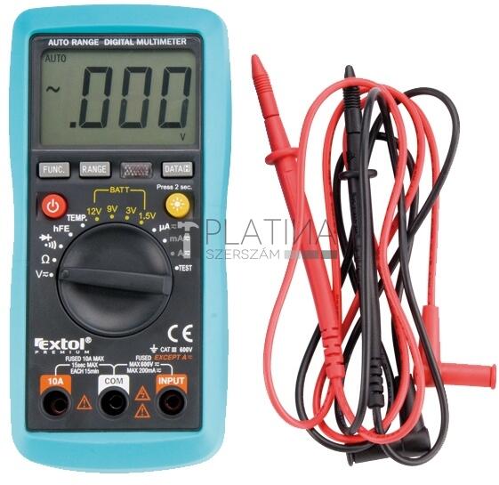 Az Extol Premium 8831250 digitális multifunkciós mérőműszer egyenfeszültség és váltakozó feszültség, egyenáram és váltakozó áram, ellenállás és hőmérséklet mérésére, diódák és tápelemek tesztelésére, valamint áramkörök vezetésének és folytonosságának vizsgálatára szolgál. A multifunkciós mérőműszer túlterhelés elleni védelemmel van ellátva, ezenkívül automatikus méréstartomány-beállítási funkcióval, az utoljára mért érték kijelző mezőben történő megőrzése funkcióval, valamint automatikus kikapcsolási funkcióval rendelkezik. A multifunkciós mérőműszer figyelmeztető jelzést ad a mérési tartomány túllépésekor, valamint információt ad a tápelemek lemerüléséről. A kijelző mező megvilágításának lehetősége lehetővé teszi a kedvezőtlen látási viszonyok melletti munkavégzést is. A multifunkciós mérőműszer jól használható a műhelyekben, a laboratóriumokban, a háztartásokban stb. 3 db 1,5V AAA elemmel szállítjukMérhető fizikai mennyiségek:- feszültség: 200 mV – 600 V egyenfeszültség, 2 V – 600 V váltakozó feszültség- áramerősség: 200 μA – 10 A váltakozó áram/egyenáram- ellenállás: 200 – 20 M- hőmérséklet: –20°C – 1000°CMérési módszer: Kettős csökkenő integrálás, A/D váltóMérési kategória CAT II (600 V)Tápelem-tesztelés: IGEN; 1.5 V, 3 V, 9 V, 12 VDiódatesztelés: IGENÁramkörök folytonosságának vizsgálata: IGENVáltakozó feszültség jelenléténekmeghatározása izolált vezetőben: IGENTranzisztorok mérése: IGENKijelző mező:folyadékkristályos (LCD), 3/5 számjegymax. megjeleníthető érték: 1999a polaritás automatikus megjelenítésea mért értékek aktualizálása: 2-3-szor másodpercenkénta tápelemek lemerülésének jelzése (a tápelem jelejelenik meg a kijelző mezőben)a mérési tartomány túllépésének jelzése (az „OL jeljelenik meg a kijelző mezőben). Üzemi hőmérséklet: 0°C – 45°C, relatív páratartalom: