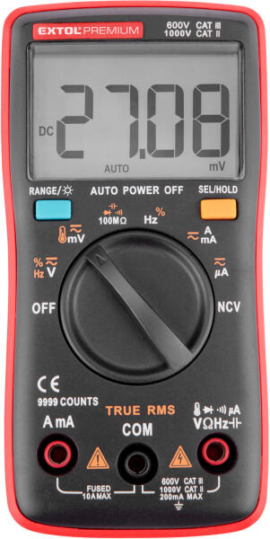 Az Extol Premium 8831254 digitális multifunkciós mérőműszer egyenfeszültség és váltakozó feszültség, egyenáram és váltakozó áram, ellenállás és hőmérséklet mérésére, diódák és tápelemek tesztelésére, valamint áramkörök vezetésének és folytonosságának vizsgálatára szolgál. True RMS funkció: valós effektív feszültség és áramerősség mérése tetszőleges alakú (nem csak színuszos) váltakozó jelek esetében is.  A multifunkciós mérőműszer túlterhelés elleni védelemmel van ellátva, ezenkívül automatikus méréstartomány-beállítási funkcióval (Auto Range) , az utoljára mért érték kijelző mezőben történő megőrzése funkcióval (Data Hold), valamint automatikus kikapcsolási funkcióval (Auto OFF) rendelkezik. A multifunkciós mérőműszer figyelmeztető jelzést ad a mérési tartomány túllépésekor, valamint információt ad a tápelemek lemerüléséről. A kijelző mező megvilágításának lehetősége lehetővé teszi a kedvezőtlen látási viszonyok melletti munkavégzést is. A multifunkciós mérőműszer jól használható a műhelyekben, a laboratóriumokban, a háztartásokban stb.  2 db 1,5V AAA elemmel szállítjuk