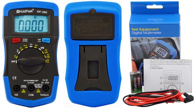 Számos elektromos mértékegység mérésére alkalmas, digitális, LCD kijelzős multiméter. Egyenfeszültség, egyenáram, váltófeszültség, váltóáram, ellenállás, kapacitás és frekvencia mérésére alkalmas. További szolgáltatása a tranzisztor, dióda tesztelő és szakadásvizsgáló funkció. - Digitális multiméter. - Automatikus méréshatár váltás. - 3.3/4 számjegyes LCD kijelző, háttérvilágítással. - Maximális értékkijelzés: 3999. - Polaritás független mérés (fordított polaritás esetén - kijelzése). - Alacsony elemfeszültség kijelzés. - Utolsó mért érték kijelzőn tartása. - VDC mérési tartomány/kijelzési felbontás/pontosság: - 400mV / 0.1mV / +/-0.8%. - 4V / 1mV / +/-0.8%. - 40V / 10mV / +/-0.8%. - 400V / 100mV / +/-0.8%. - 1000V / 1V / +/-1.5%. - Bemeneti ellenállás VDC mérési módban: 10Mohm. - Túlfeszültség védelem. - VAC mérési tartomány/kijelzési felbontás/pontosság:- 4V / 1mV / +/-1.2%. - 40V / 10mV / +/-1.2%. - 400V / 100mV / +/-1.2%. - 750V / 1V / +/-2.5%. - Váltófeszültség frekvenciatartománya: 40Hz-400Hz (4V, 40V), 40Hz-100Hz (400V, 750V). - ADC mérési tartomány/kijelzési felbontás/pontosság:- 400uA / 0.1uA / +/-1.5%. - 4000uA / 1uA / +/-1.5%. - 40mA / 10uA / +/-1%. - 400mA / 100uA / +/-1.5%. - 4A / 1mA / +/-0.8%. - 10A / 10mA / +/-3%. - AAC mérési tartomány/kijelzési felbontás/pontosság:- 400uA / 0.1uA / +/-1.8%. - 4000uA / 1uA / +/-2%. - 40mA / 10uA / +/-1.3%. - 400mA / 100uA / +/-1.8%. - 4A / 1mA / +/-2%. - 10A / 10mA / +/-3%. - Váltóáram frekvencia_ 40Hz-400Hz. - Túláramvédelem belső 250mA olvadó biztosítékkal (kivétel 4A és 10A méréshatár). - Ellenállás mérési tartomány/kijelzési felbontás/pontosság:- 400ohm / 0.1ohm / +/-1.8%. - 4khm / 1ohm / +/-1.8%. - 40kohm / 10ohm / +/-1.8%. - 400kohm / 100ohm / +/-1.8%. - 4Mohm / 1Kohm / +/-1.8%. - 40Mohm / 10kohm / +/-2%. - Kapacitás mérési tartomány/kijelzési felbontás/pontosság:- 40nF / 0.01nF / +/-1.8%. - 400nF / 0.1nF / +/-1.8%. - 4uF / 1nF / +/-1.8%. - 40uF / 10nF / +/-1.8%. - 100uF / 100nF / +/-2%. - Frekvencia mérési tartomány/kijelzési felbontás/pontosság:- 4kHz / 1Hz / +/-0.5%. - 40kHz / 10Hz / +/-0.5%. - 400kHz / 100Hz / +/-0.5%. - 4MHz / 1kHz / +/-0.5%. - 20MHz / 10kHz / +/-0.5%. - Tranzisztor hFE tesztelés. - NPN és PNP tranzisztorok mérése. - hFE tartomány: 0-1000. - Tesztelési feszültség /áram: Ib=10uA/Vce=2.4V. - Dióda teszt, 1mV felbontásban. - Szakadásvizsgálat, hangjelzéssel. - Mérőzsinór. - Kihajtható támasztó konzol. - Tápfeszültség: 9VDC 6F22 elemről. (nem tartozék)- Működési hőmérséklet: 0°C-40°C. - Működési páratartalom: maximum 85%. - Méretei: 143mm x 75mm x 32mm. - Súlya: 200g (elemmel). - CE minősítés.