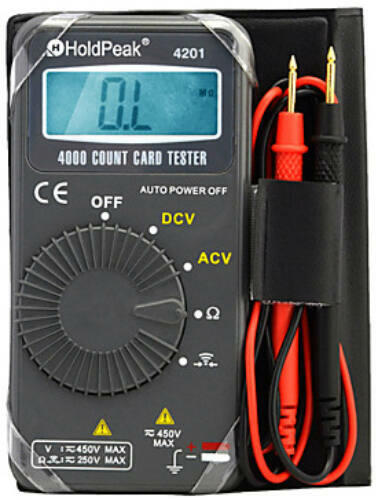 Alapvető elektromos mértékegységek mérésére alkalmas, digitális, LCD kijelzős multiméter. Egyenfeszültség, egyenáram, váltófeszültség, ellenállás mérésére alkalmas. További szolgáltatása dióda tesztelő és szakadásjelző funkció. Használata, elsősorban oktatási, hobbi és ellenőrzési célokra javasolt. Rendkívül kis méretének köszönhetően szinte bárhol elfér. - Digitális multiméter. - Automatikus méréshatár váltás. - 4 számjegyes LCD kijelző, 9mm-es karakterekkel. - Maximális értékkijelzés: 2999. - Polaritás független mérés (fordított polaritás esetén - kijelzése). - Alacsony elemfeszültség kijelzés. - Automatikus és manuális kikapcsolás. - VDC mérési tartomány/kijelzési felbontás/pontosság: - 400mV / 0.1mV / +/-1.3%. - 4V / 1mV / +/-1.3%. - 40V / 10mV / +/-1.3%. - 400V / 100mV / +/-1.3%. - 450V / 1V / +/-1.3%. - Bemeneti ellenállás VDC mérési módban: 10Mohm. - Túlfeszültség védelem. - VAC mérési tartomány/kijelzési felbontás/pontosság:- 4V / 1mV / +/-2.3%. - 40V / 10mV / +/-2.3%. - 400V / 100mV / +/-2.3%. - 450V / 1V / +/-2.3%. - Váltófeszültség frekvenciatartománya: 50Hz-400Hz. - Bemeneti ellenállás VAC mérési módban: 10Mohm. - Ellenállás mérési tartomány/kijelzési felbontás/pontosság:- 400ohm / 0.1ohm / +/-2%. - 4kohm / 1ohm / +/-2%. - 40kohm / 10ohm / +/-2%. - 400kohm / 100ohm / +/-2%. - 4Mohm / 1kohm / +/-6%. - 40Mohm / 10kohm / +/-10%. - Dióda teszt, 1mV felbontásban. - Szakadásvizsgálat, hangjelzéssel. - Mérőzsinór. - Tápfeszültség: 2.4VDC 2 db LR-44 elemről. - Működési hőmérséklet: 0°C-40°C. - Működési páratartalom: maximum 80%. - CE minősítés. - Súlya: 110g (elemmel). - Mértei: 108mm x 54mm x 12mm.