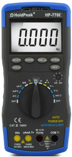 Univerzális, nagy pontosságú, digitális multiméter. Egyenfeszültség, váltófeszültség, egyenáram, váltóáram, ellenállás, kapacitás, hőmérséklet és frekvencia mérésére alkalmas. További szolgáltatása a dióda tesztelő, hFE és szakadásjelző funkció. Funkciókapcsoló jelzőlámpával és mechanikus blokkoló rendszerrel rendelkezik. Lehetőség van oszlopdiagramos kijelzésre. True RMS műszer, ezért mindig a pontos effektív értéket jeleníti meg. - Univerzális, digitális multiméter. - Automatikus és manuális méréshatár váltás. - Precíziós, nagy pontosságú. - Alacsony fogyasztás. - Stabil teljesítmény. - Alapvető pontosság: 0.05% + 2dgt. - VDC mérési tartomány: 40mV - 1000V. - VAC mérési tartomány: 40mV - 750V. - ADC mérési tartomány: 400μA - 20A. - AAC mérési tartomány: 400μA - 20A. - Ellenállás mérési tartomány: 400 - 40M. - Kapacitás mérési tartomány: 9.999nF - 99.99mF. - Hőmérséklet mérési tartomány: - 20°C - 1000°C. - Frekvencia mérési tartomány: 9.999Hz - 9.999MHz. - Maximális értékkijelzés: 40000. - Automatikus méréshatár váltás. - Dióda tesztelő. - hFE teszt. - Szakadásjelzés. - Adattárolás. - Automatikus kijelző háttérvilágítás. - Automatikus kikapcsolás. - AC/DC 600A lakat csatlakoztatható. - Funkciókapcsoló jelzőlámpa. - Mechanikus blokkoló rendszer. - Váltás °C és °F között. - True RMS. - Maximum és minimum kijelzés. - Oszlopdiagramos megjelenítés. - NCV. - 1 db 9V (6F22) elem. - Méret: 195 x 88 x 40mm. - Tömeg: 350g.