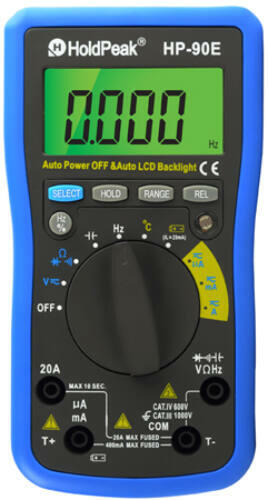 Számos elektromos mértékegység mérésére alkalmas, digitális, nagy LCD kijelzős multiméter. Kisméretű, könnyen hordozható eszköz. Egyenfeszültség, egyenáram, váltófeszültség, váltóáram, ellenállás, kapacitás, hőmérséklet és frekvencia mérésére alkalmas. További szolgáltatása a dióda tesztelő, szakadásvizsgáló és elemtesztelő funkció, valamint az automatikus háttérfény és adattárolás. - Digitális multiméter. - Automatikus és manuális méréshatár váltás. - Nagyméretű kijelző. - Stabil teljesítmény. - Könnyen hordozható. - VDC mérési tartomány: 400mV - 1000V. - VAC mérési tartomány: 400mV - 750V. - ADC mérési tartomány: 400μA - 20A. - AAC mérési tartomány: 400μA - 20A. - Ellenállás mérési tartomány: 400 - 40M. - Kapacitás mérési tartomány: 51,2nF - 100μF. - Hőmérséklet mérési tartomány: - 20°C - 1000°C. - Frekvencia mérési tartomány: 5.12Hz - 5.12MHz. - Maximális értékkijelzés: 4000. - Automatikus méréshatár váltás. - Dióda tesztelő. - Szakadásjelzés. - Adattárolás. - Automatikus kijelző háttérvilágítás. - Automatikus kikapcsolás. - Elemteszt_ 1,5V - 12V. - 1 db 9V (6F22) elem. - Méret: 167 x 90 x 50mm. - Tömeg: 320g.