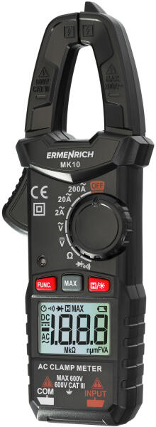 Tudjon meg többet Az Ermenrich Ping MK10 lakatfogó egy olyan hordozható mérőeszköz, amely nem igényli az áramkör megszakítását az áramerősség méréséhez, ezáltal pedig biztonságos munkavégzést tesz lehetővé az elektromos hálózatokon és berendezéseken. A digitális lakatfogó elengedhetetlen, ha nem lehet lekapcsolni az áramot, és egyszerűen használható, ha nehezen hozzáférhető helyeken kell méréseket végezni. A készülék a következő funkciókat ötvözi: voltmérő (egyen- és váltakozó feszültség mérése), ampermérő (váltakozó áram mérése) és ohmmérő (ellenállás mérése). A számítások True RMS funkció segítségével kerülnek végrehajtásra, így a változó mennyiségek mérési pontossága nagy. A modell további funkciói közé az áramkör folytonosságának ellenőrzése és a diódák hibatesztelése tartozik. A készülék mérési eredményei és működési paraméterei a beépített képernyőn jelennek meg. A képernyő háttérvilágítása megkönnyíti a munkát még gyenge fényviszonyok vagy teljes sötétség esetén is. Az adattartás funkció olyan helyzetben hasznos, amikor nem lehet azonnal leolvasni a mért értékeket a készülékről. Aktivált állapot esetén az értékek „befagyasztásra kerülnek a képernyőn, így később is elérhetők. A készülék működtetéséhez két darab szabványos elem szükséges. Az automatikus kikapcsolási funkció segít energiát megtakarítani. Ha az elemek töltésszintje alacsony, egy értesítés jelenik meg, jelezve, hogy ki kell cserélni őket. Főbb jellemzők: