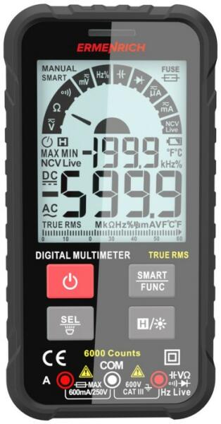 Ermenrich Zing TC19 digitális multiméterAz Ermenrich Zing TC19 digitális multiméter elengedhetetlen eszköz a professzionális villanyszerelők napi munkája során. A mindennapi életben is segít az elektromos készülékek és a vezetékek tesztelésében, és képes megtalálni az autó elektromos rendszerén belüli hibákat. Kompakt és rendkívül könnyű kialakítása megkönnyíti a hordozást, az egyszerű kezelőszervek pedig megkönnyítik a rutinmunkát. A multiméter nagy mérési pontosságot biztosít, hiszen True RMS számításokat használ. A multiméter méri a feszültséget, az ellenállást, az áramerősséget, a frekvenciát, a kapacitást és a munkaciklust. További funkciói közé tartozik a hálózatok nyitott vagy rövidre zárt áramköreire irányuló tesztelése, a diódateszt, az érintésmentes feszültség-érzékelés (NCV) és a fázisérzékelés. A Smart funkció megkönnyíti az elektromos jel alapvető jellemzőinek mérését. A tartás funkció akkor hasznos, ha szeretné „befagyasztani a képernyőn megjelenő értékeket, hogy később meg tudja nézni azokat. A készülék monokróm képernyővel rendelkezik, amely megjeleníti a grafikus skálát és a leolvasott értékeket. A multiméter zseblámpával rendelkezik, így gyenge fényviszonyok mellett és elektromos elosztószekrényeken is dolgozhat. Az eszköz standard elemekkel működik. Az energiatakarékos használat érdekében automatikusan kikapcsol, ha hosszabb ideig nem használják. Főbb jellemzők:Multifunkcionális, digitális multiméterA következő funkciókat ötvözi: feszültségmérés, áramerősség-mérés, ellenállásmérés, kapacitásmérés, frekvenciamérés és munkaciklusmérésFázisérzékelés, diódateszt, NCV-funkció, szakadásvizsgálat, True RMS számításokKiegészítő grafikus skála a képernyő könnyű leolvasásáhozHagyományos elemekkel működikA készlet tartalma:Digitális multiméterMérőszondákTokFelhasznál i kézikönyv és garanciajegyMárkaErmenrichSzavatosság5 évEAN5905555017631A csomag méretei (HxSzxM):16x9x5 cmSzállítási súly0.26 kgA mérési határérték kiválasztásaautomataAlapfunkciókfesz ltségmérés, áramerősség-mérés, ellenállásmérés, kapacitásmérés, frekvenciamérés, munkaciklusmérésDC (egyenáramú) feszültségmérési határérték60 mV/600 mV/6 V/60 V/600 V: hiba ±(0,5%+3)AC (egyenáramú) feszültségmérési határérték60 mV/600 mV/6 V/60 V/600 V: hiba ±(1,0%+3)DC áramerősség mérési határérték6000 A/60 mA/600 mA: hiba ±(1,2%+5)AC áramerősség mérési határérték6000 A/60 mA/600 mA: hiba ±(1,5%+5)Ellenállás mérési határérték600 /6 k/60 k/600 k/6 M/60 M: hiba ±(1,0%+5)Kapacitásmérési határérték6 nF/60 nF/600 nF/6 μF/60 μF/600 μF/6 mF/60 mF: hiba ±(4,0%+5)Frekvenciamérési határértékek10 Hz/100 Hz/1000 Hz/10 kHz/100 kHz/1000 kHz/10 MHz: hiba ±(1,0%+5)Munkaciklus méréstartomány1–99%: hiba ±(3,0%+5)Dióda tesztyesÉrintés nélküli feszültségérzékelés (NCV érzékelés)yesTrue RMSyesTartás funkcióyesAutomatikus felismerés funkció (Smart)+ (csak DC és AC feszültség, ellenállás és szakadásvizsgálat esetén)Fázisérzékelő (Live)yesTúlfeszültség kategóriaCAT III 600 VKijelző visszaszámláló6000Kijelző háttérfényyesGrafikus skálayesZseblámpayesBiztonsági szabványokEN61010-1, -2-030; EN61010-2-033; EN61326-1Folytonossági tesztyesTápellátás2 db CR2032 típusú elem (a készlet nem tartalmazza)Lemerülőben lévő elem jelzőlámpájayesAutomatikus kikapcsolásyes