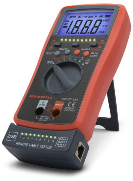 2 az 1-ben műszer, általános multiméter funkciókkal, kábeltesztelő egységgel kiegészítve. A kontroll egység levehető és szabadon hordozható. RJ11, RJ12, RJ45 és USB vezetékek teszteléséhez alkalmazható. Automata méréshatár váltás a még kényelmesebb használatért.