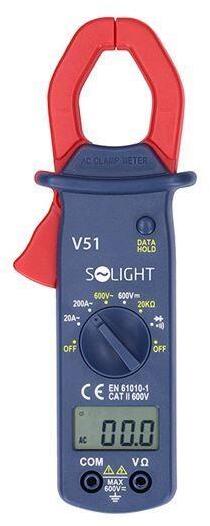 Solight bilincses multiméter, 20 - 200AA Solight digitális multiméter maximum 2000 érték kijelzésével rendelkezik. Az alacsony akkumulátor töltöttséget a kijelzőn megjelenő figyelmeztető ikon jelzi. Automatikus leállás15 perc inaktivitás után a multiméter automatikusan kikapcsol. A kikapcsolás előtt egy hangjelzés hangzik el. MérésekEgyenfeszültség: 600V-ig terjedő tartomány (±1,0%5 számjegy)AC feszültség (True-RMS): 600V-ig terjedő tartomány (±1,2%8 számjegy)Váltakozó áram: 20A és 200A közötti tartomány (±2,5%10 számjegy)Ellenállás: 20k-ig terjedő tartomány? (±1,5%5 számjegy)Folyamatossági és diódatesztA csengő folytonossági tesztjének kioldási határa