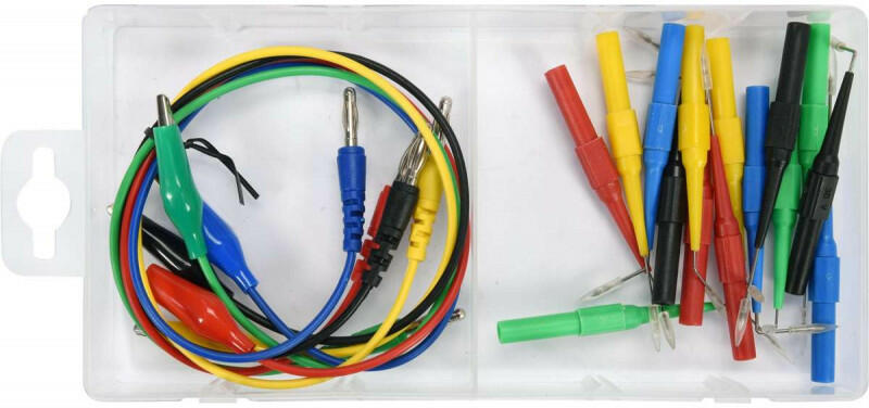 Vezeték és csatlakozó készlet multiméterekhez, kiválóan használható személygépkocsik és teherautók elektromos rendszereinek gyors tesztelésére. Praktikus csomagban, 20 elemből álló készlet, az elemek a legtöbb rendelkezésre álló multiméterhez illeszkednek.
