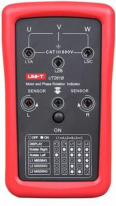 Uni-T UT261B fázissorrend-mérő MŰKÖDÉSI PARAMÉTEREK: AC feszültség: 90 ~ 600 V Frekvencia: 15 ~ 400 Hz Üzemi áram: & lt; 3 mA FUNKCIÓK: Fázissorrend észlelése: LED értesítés Hiányzó fázisérzékelés: LED értesítés Motor forgás jelzés: LED értesítés ÁLTALÁNOS JELLEMZŐK: Tápellátás: 9 V-os elem (6F22) Méretek: 123 x 71 x 29 mm Súly: 180 g Tartozékok: Akkumulátor, mérővezetékek